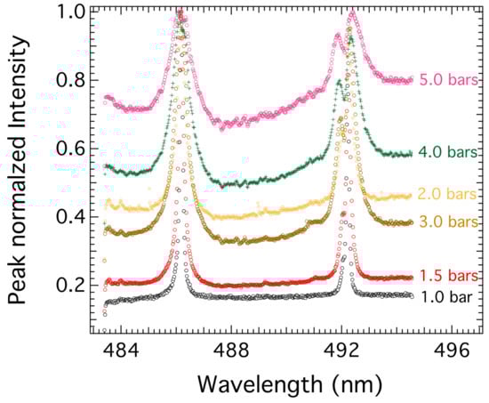 The experimental spectra proposed as a best-fit challenge for the codes here were measured in a corona discharge in helium performed in an electrical engineering laboratory for the study of the dielectric properties of insulators [,]. The spectra of the H-β line were measured at room temperature for various values of pressure. The spectra corresponding to six values of the pressure in the range 1–5 bars are shown in Figure 11. Before presenting the fitting results of these spectra, it is necessary to give some insights into the broadening mechanisms affecting the H-β line emitted in helium plasma in which the hydrogen atoms represent a small fraction of the environment.