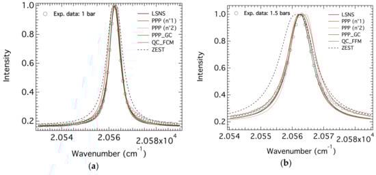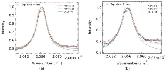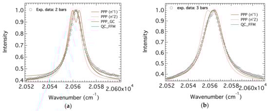 It can be seen from Figure 13a that the data are well fitted by the PPP calculations (n°1) and QC_FFM, the attempt of PPP_GC does not fit the spectrum. For case P = 3 bars illustrated in Figure 13b, one can see that both PPP (n°1) and QC_FFM are able to reproduce the experimental spectrum. As indicated previously, the best parameters will be summarized in Table 3.