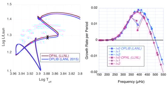 We first examine the difference in evolution track in the Hertzsprung-Russell (H-R) diagram (log luminosity vs. log effective temperature) and the calculated frequencies and growth rates of degree l = 0–2 p modes for T = 7600 K models using OPAL vs. OPLIB opacities (Figure 1). The 2 M model using OPAL opacities evolves at slightly higher luminosity for the same effective temperature. We found slightly higher growth rates for the l = 0–2 p modes using the OPLIB opacities.