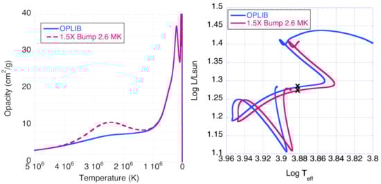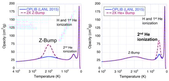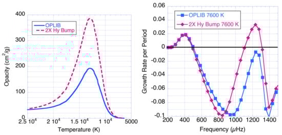 For A-type stars, namely the Sct variables, p-mode pulsations are driven by the effect produced by the 2nd ionization of helium around 50,000 K. Balona et al. [] carried out an extensive parameter study to search for pulsation instability of low-frequency modes that are found in many Sct variables observed by the Kepler spacecraft. They varied mass, helium abundance, metallicity, rotation rate, and considered OPAL vs. OP [] opacities. They also consider opacity enhancements around the Z-bump (log T = 5.35, or T = 224,000 K), and at the so-called “Kurucz bump” at log T = 5.06 (T = 114,800 K), first noted in opacities developed for model atmospheres [] and discussed by Cugier [] for B-type star pulsations. Balona et al. [] find that an opacity enhancement of at least a factor of two at the Kurucz bump is needed to excite low-frequency modes; however, they do not advocate such an opacity enhancement as the explanation for the low frequencies observed in Sct stars.
