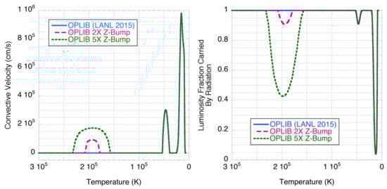 Convective velocity (left) and fraction of luminosity carried by radiation (right) vs. temperature for 2 M models with T = 7600 K, with and without ×2 and ×5 opacity increases in the Z-bump region.