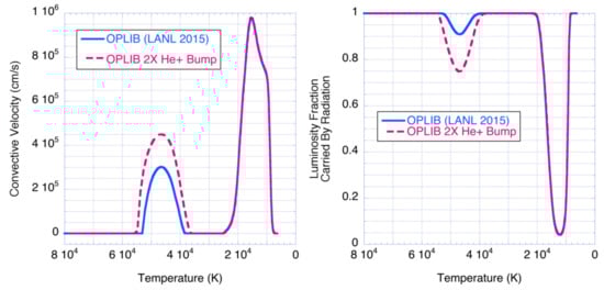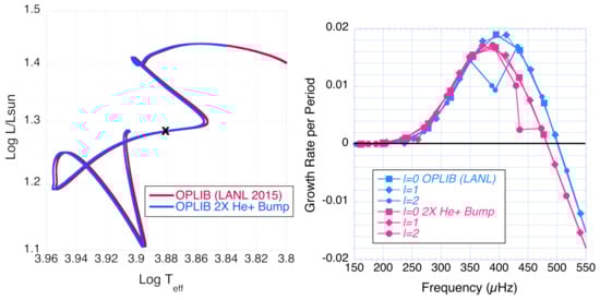 We multiplied the opacity by a Gaussian function peaking at ×2 in the 2nd He ionization region centered at 50,000 K (Figure 2, right). We find that this He ionization region opacity increase has very little effect on the 2 M evolution track in the H-R diagram (Figure 4, left). Increased He opacity shifts the unstable l = 0–2 p-mode frequency range to lower frequencies and also reduces the growth rates (Figure 4, right). Increased He opacity causes more luminosity to be carried by convection, weakening the -effect pulsation driving. With the opacity increase, convective velocities become larger by a factor of two, as high as 4 × 10 cm/s. Convection then carries 25% of the luminosity, instead of 10% (Figure 5).