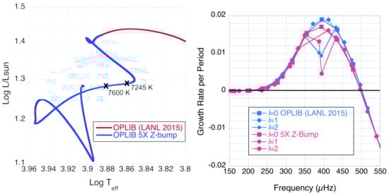 We multiplied the opacities by a Gaussian function peaking at ×5 for the Z-bump region centered at 200,000 K. The ×5 Z-bump opacity increase has almost no effect on the 2 M evolution track in the H-R diagram (Figure 6, left). However, the ×5 Z-bump opacity increase induces a wide convection zone at ∼200,000 K, and convective velocities ∼2 ×10 cm/s, with convection carrying almost 60% of the luminosity (Figure 3). The Z-bump ×5 opacity increase has almost no effect on l = 0–2 p-mode pulsations; growth rates become slightly lower for some modes (Figure 6, right).