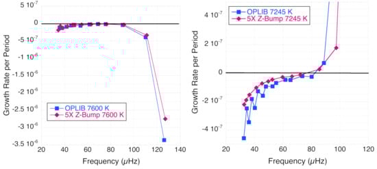 Long time-series high-precision photometry has revealed low-frequency g-mode pulsations among many A-type and Scuti variables that were not predicted by theoretical models [,,]. g-mode pulsations are observed for cooler late-A to F-type Doradus variable stars, and explained by the convective-blocking mechanism [] operating at the base of the deeper convective envelope that is not present in early A-type stars. We were hoping that the new convection zone induced by opacity enhancements in the Z-bump region might cause g-mode pulsation driving via the convective-blocking mechanism. However, we find that for 2 MT = 7600 K models, the ×5 Z-bump enhancement does not affect low-order l = 1 or 2 g-mode stability; the low-order g modes have slightly less negative growth rates, but are still stable (Figure 7, left). One or two of the highest frequency l = 2 g modes become unstable for cooler (T = 7245 K) models, even without an opacity enhancement (Figure 7, right). The growth rates become lower with the ×5 Z-bump increase, likely because these modes are actually driven by the effect (and not the convective-blocking mechanism) that is weakened by convection.