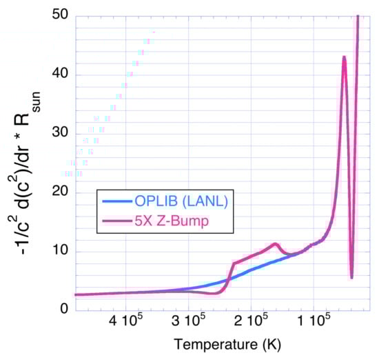 Would higher opacities that extend a convective region or induce a new convective region have observable signatures? Deal et al. [,] discuss the effects of molecular-weight gradient instabilities and “fingering convection” induced by localized element accumulation via diffusive settling and radiative levitation on the evolution and surface abundances of Sct stars. They find that surface abundances of C, N, O, Ne, Mg, Ca and Fe can be altered if fingering convection connects the surface convective layers to deeper layers. A transition from a radiative to convective region at the Z-bump location could also have a signature in asteroseismic inversions, for example, on the inferred sound-speed gradient. Figure 8 compares the radial derivative of the squared sound speed vs. temperature for models with and without the ×5 Z-bump enhancement. High precision observations of Sct variables showing many p modes of several angular degrees may be amenable to inversion techniques that could detect changes in the sound-speed gradient.