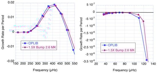 Fractional kinetic-energy growth rate per period (dimensionless) vs. frequency for l = 1 p modes (left) and l = 2 g modes (right) for T = 7600 K models with and without ×1.5 opacity enhancement at 2.6 million K.