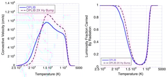 Convective velocity (left) and fraction of luminosity carried by radiation (right) vs. temperature for 2 M models with T = 7600 K, with and without ×2 opacity increase in the hydrogen and first He ionization region.