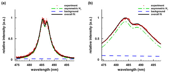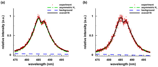 The analysis of the recorded line profiles, over and above the evaluation of the FWHM, includes fitting of tabulated profiles [27,28], fitting to Voigt profiles or Lorentz profiles, and, recently, fitting to asymmetric hydrogen beta profiles [34]. The latter approach allows one to efficiently analyze Abel-inverted data sets in investigations of radial plasma expansion phenomena.