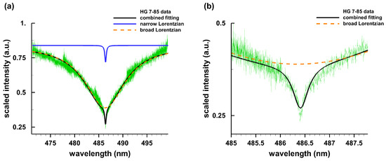 The gravitational shift of HG 7-85 [65] is 44.3 km/s. Using Equation (1), the corresponding wavelength shift at 486.14 nm amounts to . Note that the center wavelength of the broad Lorentzian fit is at 486.22 nm, or shifted by 0.08 nm . Clearly, further modeling of the atmosphere condition for this Hyades WD would be needed to evaluate the accuracy of this inference. However, the appearance of the H spectrum from HG 7-85 could very well indicate absorption from a dense and two orders of magnitude less dense WD atmosphere, as perhaps suggested for other WDs by including carbon, nitrogen, and oxygen in WD atmospheres models [39].