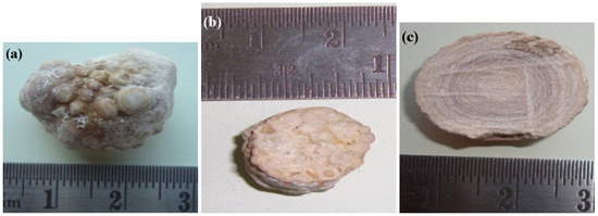 Calcified gallstones: (a) granular gallstone and cross-section of (b) granular and (c) non-granular gallstones.