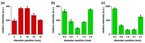 Trends of the measured signals of Mg I 280.2 nm along cross-sections: (a) 20-mm non-granular gallstone; (b) 2-mm; and (c) 3-mm granules of granular gallstone.