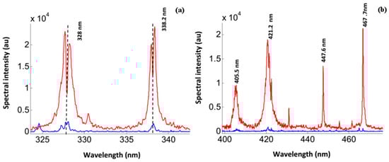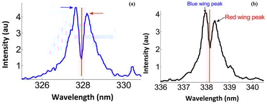 There is a clear larger emission from the nano-based silver plasma than from plasma created from the bulk target (ratio of the red to blue curves). Detailed inspection of the resonant transitions (4d105p-4d105s) at wavelengths of 327.9 nm and 338.2 nm (as depicted in Figure 2) indicates the existence of self-reversal as well as self-absorption.