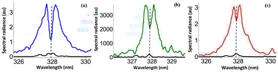 Self-reversal of the resonance Ag I line at 327.9 nm. Laser wavelengths: (a) 355 nm, (b) 532 nm, and (c) 1064 nm. The colored, larger, black, and lower plasma spectra are measured from nano-based and bulk silver targets, respectively.
