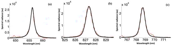 Fitting of line shapes (red) to Voigt line shape (black) for the Hα-line (a) and the Ag I lines at 827.35 (b) and 768.7 nm (c) at fixed laser fluence 9.6 J/cm2 and IR laser at 1064 nm excitation.