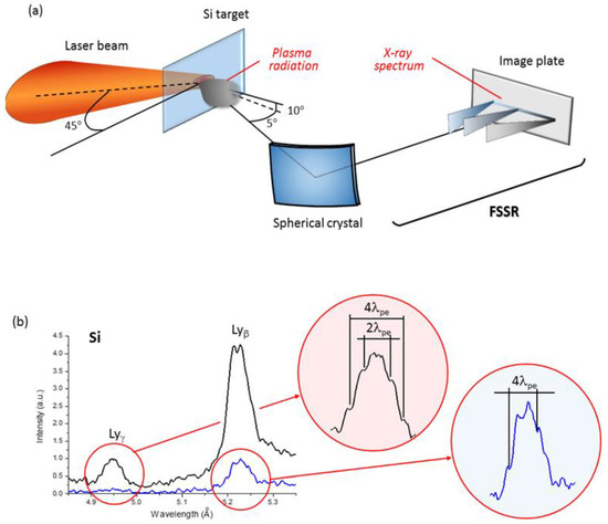 The X-ray emission of the plasma was registered by means of a high luminosity focusing spectrometer, with a spatial resolution (FSSR) [18], at the directions close to the normal to the target surface, from the rear side of the target. To obtain the spectra with a high spectral resolution (λ/δλ~3000) in a rather broad wavelength window the FSSR was equipped with quartz/mica spherically bent crystals [19,20] settled to record K-shell emission of Rydberg H-like spectral lines of multi charged SiXIV and AlXIII ions. For reducing the level of noise caused by the background fogging and crystal fluorescence, a pair of 0.5 T neodymium–iron–boron permanent magnets (not reproduced in Figure 1a), which formed a slit of 10 µm wide, was placed in front of the crystal. The spectra were recorded by means of Fujifilm TR Image Plate (IP) detectors protected against the exposure to the visible light by two layers of 1 µm-thick polypropylene (C3H6)n with 0.2 µm Al coating. Additionally, to prevent saturation of the detectors, the Mylar (C10H8O4) filter of 5 µm thickness was placed at the magnet entrance. Moreover, some of pure Si and Al targets were coated with or buried into thin plastic (CH) in order to keep the plasma of the main layer at solid densities regardless of the impact of the laser pre-pulse.