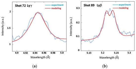 Let us consider the experimental profiles of Si XIV Lyγ, produced in an interaction with a single laser pulse with initial laser intensity at the surface of the target estimated as 1.01 × 1021 W/cm2 (black trace in Figure 1b), and Si XIV Lyβ, produced in an interaction with a single laser pulse with initial laser intensity at the surface of the target estimated as 0.24 × 1021 W/cm2 (blue trace in Figure 1b) [12]. For these profiles the peak-intensity contrast ratio was 109. We mention that L-dips were not observed in the experimental profile of Si XIV Lyβ line in the black trace Figure 1b. It seems that a process of self-absorption of radiation prevented L-dips from being visible in this line. We note that without the self-absorption the Lyβ line would show a relatively deep central minimum (related not to the the L-dips, but to the structure of the Stark splitting of this line) and shallow L-dips. The self-absorption completely washes out the L-dips but does not completely washes out the central minimum: it just makes it shallow instead of being relatively deep. As for the Lyγ line in the black trace Figure 1b, at the possible locations of the L-dips, the experimental profile already merged into the noise.