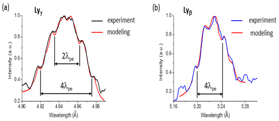 Figure 1b shows as examples the experimental spectra of Si XIV Lyβ and Lyγ lines in two different shots with duration of 600 fs and laser intensities at the surface of the target theoretically estimated as 1.01 × 1021 W/cm2 and 0.24 × 1021 W/cm2, respectively. The positions of the dips/depressions in the profiles are marked in insets by vertical lines separated either by 2λpe or 4λpe, where (λ0 is the unperturbed wavelength of the corresponding line and the plasma electron frequency).