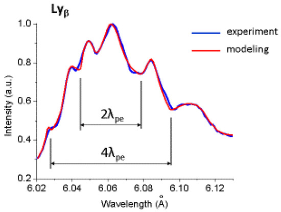 Now we proceed to analyze the experimental profile of the Si XIV Lyβ line in shot D (Figure 5). The experimental profile does not show bump–dip–bump structures—in distinction to shots A, B, and C. In shot D, the incident laser intensity was I = 8.8 × 1019 W/cm2, significantly lower than in shots A, B, and C. The corresponding relativistic critical density is Ncr = 6.6 × 1021 cm−3. The modeling of this spectra using the code FLYCHK yielded Ne = 1.7 × 1023 cm−3, which is one and a half order of magnitude higher than the relativistic critical density and by an order of magnitude higher than the region of the electron density Ne = 2.2 × 1022 cm−3 from which the experimental profiles were emitted in shots A, B, and C is not reliable for the interpretation of shot D profile. The most probable interpretation of the experimental profile in shot D is the following.