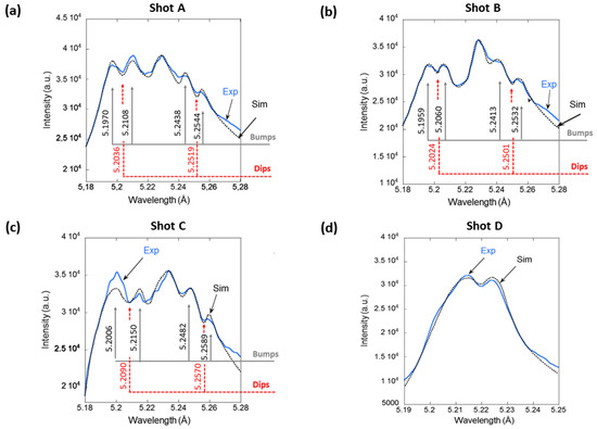 Figure 5 shows the comparisons of the robust computations, allowing in particular, for the LET and L-dips, with the corresponding experimental profiles from shots A, B, C. The L-super-dip is observed twice in the experimental profiles: one in the blue part and the other in the red part. These L-super-dips are located practically symmetrically at the distance Δλdip(Ne) = 24 mÅ from the unperturbed wavelength. According to Equation (3) with |q|s = 2, this translates into the electron density Ne = 2.2 × 1022 cm−3 The theoretical profiles were calculated for this density 2.2 × 1022 cm−3 and the temperature T = 600, 550, and 600 eV for shots A, B, and C, respectively. The comparison demonstrates a good agreement between the theoretical and experimental profiles, and thus reinforces the good interpretation of these experimental profiles. Moreover, it reinforces that it was the PDI at the surface of the relativistic critical density that produced simultaneously the Langmuir waves and the ion acoustic turbulence in shots A, B, and C. The modeling of the experimental profiles A, B, C using the code FLYCHK [34] (Figure 6) confirmed once more the need to introduce the LET for the interpretation. This innovative code yielded T = 500 eV and Ne = 6 × 1023 cm−3. This value of Ne is one and a half orders of magnitude higher than the electron density Ne = 2.2 × 1022 cm−3 deduced from the experimental L-dips.