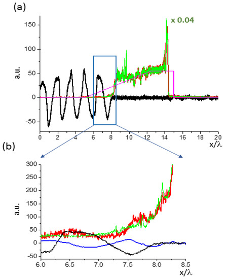 At the peak of the laser pulse intensity (t = 320 fs) it is seen that the scale of laser field decay is close to the scale of the plasma inhomogeneity. The longitudinal field of the Langmuir wave El appeared in the vicinity of the point where the density is about one-quarter of the relativistic critical density. The Langmuir wave exists up to a point slightly above the relativistic critical density Ncr = 3.6 × 1022 cm−3. In Figure 7b, the region near the relativistic critical density is 6λ < x < 8.25λ: the small modulation of ion density in this region shown by the green line is the manifestation of the ion acoustic wave. Similar processes of such parametric decays (t → l + l’, s) were studied in the past [36], but for significantly lower laser intensities.