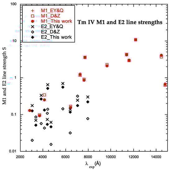 Figure 1 shows the distribution of M1 and E2 line strengths of Table 2 versus experimental wavelengths for Tm IV. One can see that for M1 transitions, our parametric calculations led to results that are in good agreement with the semi-empirical calculations in [], and with the ab initio calculations in []. The standard deviation is about 2% between our results and the previous semi-empirical results [], and is about 9% between our results and the ab initio results []. The predicted line at 4266 Å, a mixture of M1 and E2, had a M1 line strength showing a large discrepancy with the ab initio value []. The corresponding gA value was not explicitly given in []. For this line, the cancellation factor (CF) derived in our calculations from Cowan codes was 0.00, meaning an unreliable result. For E2, the three calculations give more scattered results. However, for the lines at 3039, 3847, 4437, 4721, 5759, 6402 and 7968 Å, indicated in [] as having large discrepancies with ab initio values, our values are much closer to the values in []. One may note that in Tm IV, the E2 transitions have line strengths of two orders of magnitude lower than the M1 transitions. The cancellation factors calculated in this work were on average smaller for E2 than for the M1, meaning that the gA values are less reliable for E2 transitions.