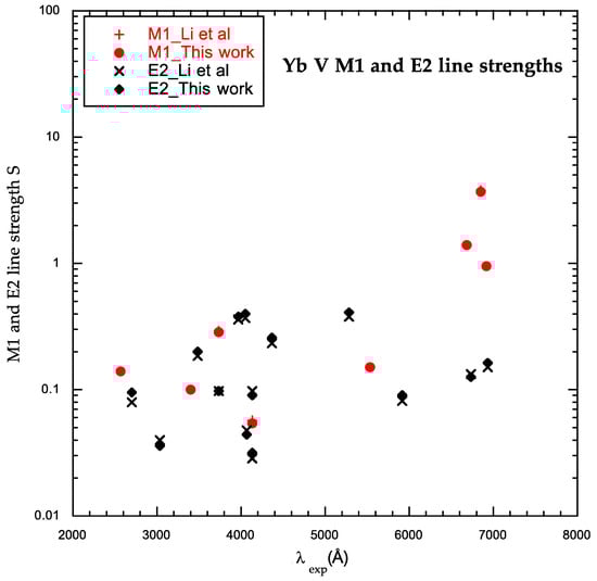 Figure 2 displays the M1 and E2 line strengths in Yb V in the wavelength range reduced to 2000–8000 Å for clarity. One can see that the two sets of line strengths are in good agreement, with relative differences less than 3% for M1 lines, except for 3810 Å and 28,836 Å, and less than 10% for E2 lines, except for the lines et 2702, 3810, and 4133 Å. It can be noticed in Table 3 that each of these transitions involved one level with a strong mixing of LS components. Indeed, for the levels 6112.03 cm−1 (4), 24,192.89 cm−1 (4), and 43,119.5 cm−1 (2), Meftah et al [] reported the main LS components with the percentage compositions of 62% 1G, 56% 3H, and 56% 1D (4f12), respectively. The calculated gA could be rather sensitive to small changes in these percentages.