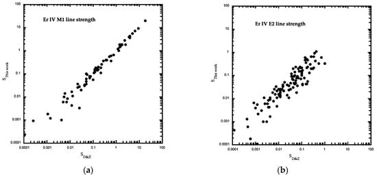 The recent analysis [] of Er IV, isoionic of Tm IV, led to the determination of 120 energy levels belonging to the lower parts of the four configurations 4f11, 4f105d, 6s, and 6p. Unfortunately, the experimental energies of the 4f11 ground-state configuration that comprises 41 levels were less completely known than in Tm IV and Yb V cases. However, in the parametric study of the odd-parity configurations, the least-squares fit with 11 free parameters upon respectively nine and 29 known levels of 4f11 and 4f106p resulted in a mean error of 41 cm−1, which was quite satisfactory for the average energies of respectively Eav(4f11) = 35,997 cm−1 and Eav(4f106p) = 207,022 cm−1. Using the parameters of the final fit given in Table 4 of [], we calculated the semi-empirical transition probabilities for M1 and E2 transitions within the ground-state configuration 4f11 of Er IV. Table 4 reports the present results on M1 transitions between 3000 Å and 17,000 Å, the ab initio values of which are available in Dodson and Zia [] to make a comparison possible. Table 5 reports similar results for E2 transition probabilities. Figure 3a,b display respectively the M1 and E2 line strengths from the present work versus the ab initio results from [].