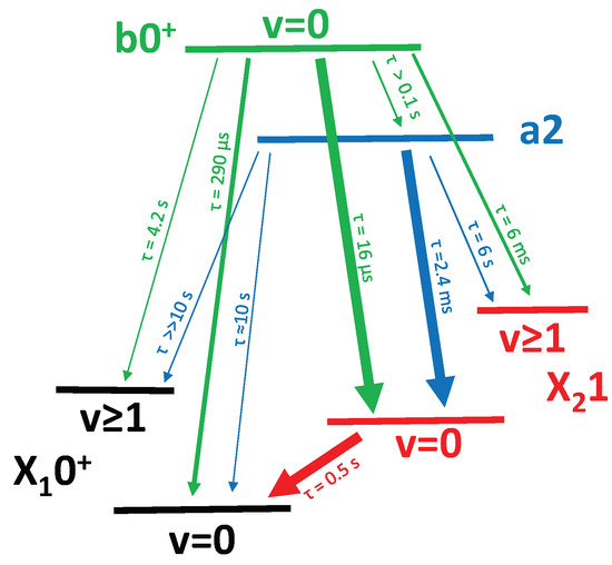 The isoelectronic molecule SbH was observed to have significant magnetic dipole transition moments on X → b transitions [29]. Magnetic dipole transitions will connect states of the same parity, so these transitions are useful for state preparation of a single parity state, which would otherwise require an additional step to the cooling process. The TeH magnetic dipole moments for the b () and () transitions (Figure 3) were computed using MOLPRO [35] and input into LEVEL 16 [34] to obtain the Einstein A coefficients. The magnetic dipole spontaneous emission rates for the b and transitions are 70-times slower and five-times faster than the corresponding E1 transitions, respectively. We therefore include these M1 transitions in our simulation of the cooling dynamics.
