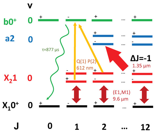 The lifetime of the state is long compared to excited vibrational state lifetimes of , so we do not consider rotational cooling via the transition. For any cooling scheme, however, will be important as it is the strongest decay channel of both b and a2. The addition of this laser significantly reduces the complexity of the four-level system by (1) effectively reducing of and into a single state and (2) via the relatively strong M1 transition, providing different parity coupling than in E1 transitions (Figure 4).