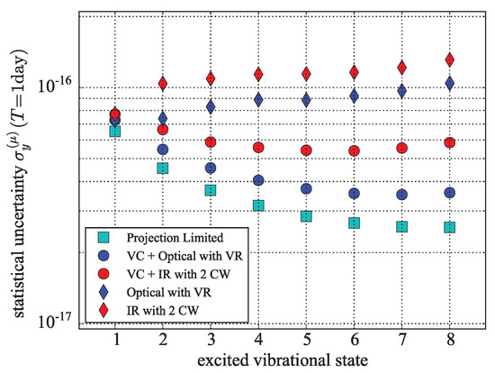 Simulation results for statistical uncertainty using various state preparation schemes, a single TeH ion and for one day of averaging. Squares represent the projection noise-limited outcome, corresponding to instantaneous state preparation with 100% fidelity. ‘Optical’ indicates results for rotational cooling at 600 nm, with vibrational repump (VR) included. ‘IR’ refers to rotational cooling at 1300 nm, with two CW-assist lasers included. Diamonds indicate results without vibrational cooling, and circles indicate results with each cycle ending with vibrational cooling (VC) followed by rotational cooling.