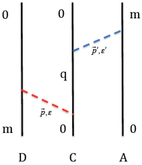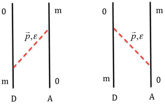 In the case of RET, since virtual emission followed by absorption may occur at either site, two distinct time-ordered diagrams may be drawn, the sum of whose amplitudes yields the correct total matrix element at second-order in the coupling [54]. The two graphs are shown in Figure 1. In these variants to Feynman diagrams, applicable to light interacting with non-relativistic charged particles, time progresses upwards with a solid line depicting the state of the atom or molecule. An angled dashed line indicates a photon, characterized by its mode. Intersection of dashed and solid lines corresponds to radiation-matter coupling. In the present example, the electric dipoles of D and A interact with the electric displacement field, with the coupling Hamiltonian given by Equation (7). The mode of the single virtual photon exchanged between the pair is labelled The polarization is summed over all index values and integration is performed over all possible values of the momentum of the virtual photon. The conversion of discrete wave vectors to a continuous variable is done through the relation