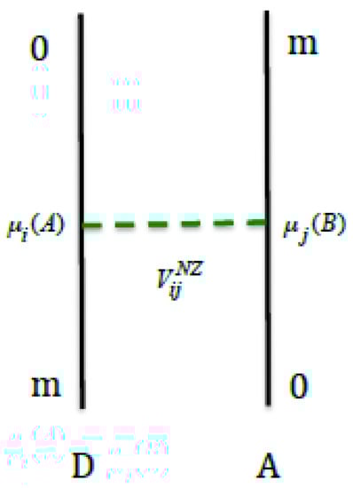 From Figure 1 it is seen that the diagram on the left gives rise to an intermediate state in which both particles are in the ground state and one virtual photon is in transit, while the other diagram produces the intermediate state in which D and A are both electronically excited in state with one virtual photon again in propagation, this time emanating from center A. Utilizing the initial, intermediate and final states, together with the perturbation operator Equation (7) in Formula (10) yields for the sum of both diagrams in Figure 1, the probability amplitude
