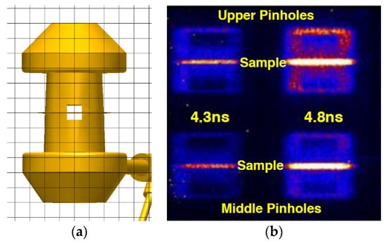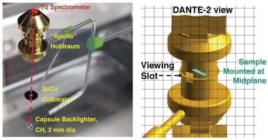 Note that in Figure 2, the laser drive is higher from the bottom, to balance out X-ray losses through the larger lower laser entrance hole of the slightly conical hohlraum. The hohlraum interior is tapered along a cone with 3° half-angle. This ensures that the spectrometer cannot see the hot gold walls, whose X-ray emission would add undesirable backgrounds to the spectra []. Five separate hohlraum designs were tested before the McFee–Apollo concept succeeded in providing sufficiently low X-ray backgrounds for axial absorption spectroscopy of the sample. Further details about the hohlraum design, fabrication, and modeling are available [,,].