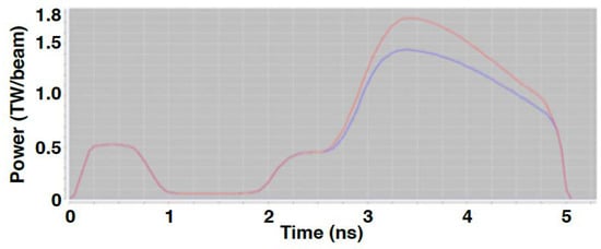 Laser pulse shapes used to drive the hohlraum from the OpSpec side (blue trace, 32 beams) and the backlighter side (red trace, 32 beams). The drive from the backlighter side is larger because the hohlraum diameter is larger on that side, by design.