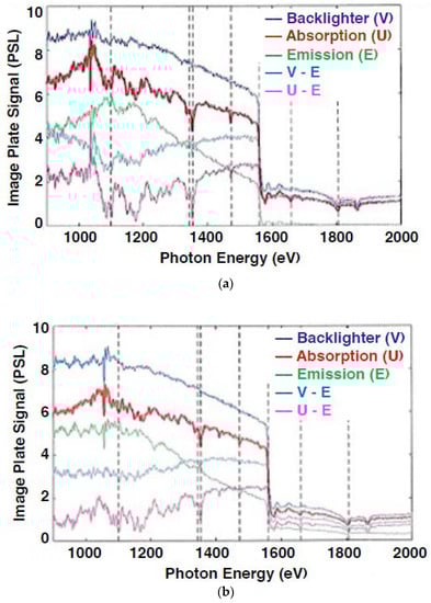 The X-ray transmission measurement itself is produced using point-projection X-ray spectroscopy as illustrated in Figure 1 (left), following previous design and implementation work [,]. Specific details of the opacity spectrometer (OpSpec) setup for shot N171214-001 are given below, but in brief the underlying symmetry of the experimental platform enables OpSpec to record two sets of spectra per shot, one per image plate, with each side of the spectrometer observing half of the sample in transmission, together with the backlighter spectrum passing around the sample on one side [,,]. The two image plate detectors each record spectra from ~1000 to 2000 eV in one dimension, spatially resolving the spectra from the sample absorption (region U), backlighter (region V), sample self-emission (region E), and various instrument backgrounds in the other dimension. After correcting for the backgrounds, which is non-trivial as discussed in Section 4, the X-ray transmission, T, can be extracted from the data using the formula T = (U − E)/(V − E).