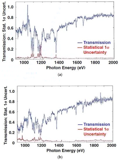To discriminate between the opacity models and the Z experiments, an overall accuracy level of 10% is required for the opacity, which in turn requires X-ray transmissions accurate to an absolute level of ±0.02 []. Attention has been paid to achieving the required statistical uncertainty level [,,], and the results in Section 4 demonstrate this for much of the spectrum. However, other parts of the spectrum need further improvement, and additional shots are needed to confirm reproducibility of the statistical data quality. However, statistics is not the whole story: extremely careful work is also required to ensure that systematic uncertainties do not cause additional transmission uncertainties beyond the ±0.02 requirement. This is currently a main focus of the research.