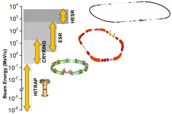 An overview of the storage facilities for highly charged ions of GSI and FAIR with their respective energy ranges is displayed. Stable ions as well as unstable nuclides are injected into the Experimental Storage Ring (ESR) [18] where they are stored, cooled by the interaction with an electron beam, and decelerated to the energy desired for a specific experiment. The ESR is connected to the low-energy storage ring CRYRING [20]. In the CRYRING, the ions may be stored and cooled at a maximum energy of 14 MeV/u or further decelerated. From the CRYRING, a transfer beam line leads to the HITRAP facility [21,22] where the ions are loaded into a Penning trap and cooled to a kinetic energy corresponding to about 4 K. On the high-energy side, stable and unstable nuclides will be injected into the High Energy Storage Ring (HESR) at the FAIR facility [25]. All storage facilities are or will be equipped with several experimental installations, including a transverse gas-jet target and a facility for laser spectroscopy. This figure was reprinted from [26] (used by permission).