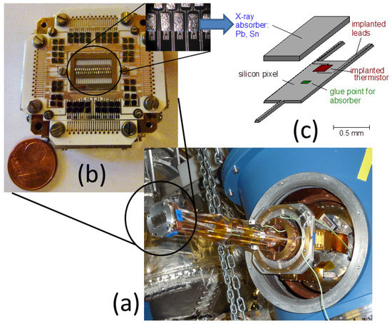 The silicon thermistors for ESR experiments were equipped with absorbers of lead (thickness 50 µm) or tin (thickness 100 µm) [59,60]. Thus, the quantum efficiency obtained for 100 keV X-rays is around 20%. The active area per pixel is around 0.35 mm2. For a fully equipped detector array with 32 pixels, this amounts to an active detector area of 11 mm2. The thermal decay constant of around 1 ms at the operating temperature of 50 mK permits count rates of around 1 Hz without the need for pile-up correction. Figure 3 displays the layout of one pixel [46], one of the detector arrays used in the ESR experiments [60] and a close-up where the tin and lead absorbers are visible. The cryogenic setup is discussed in the next section.