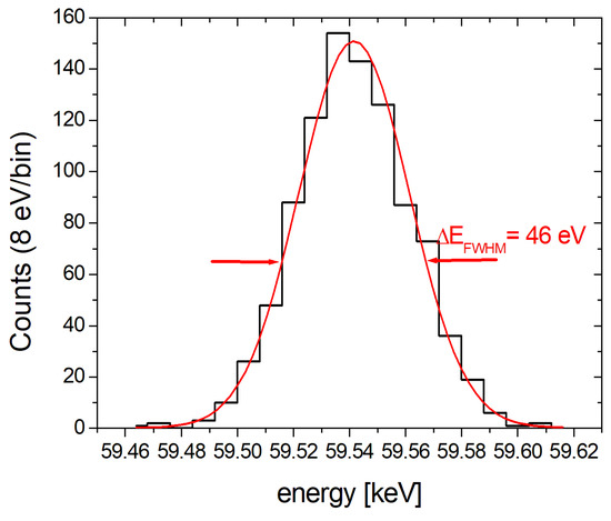 The detector pixels were characterized in the laboratory using a 241Am source with a -line at about 59.5 keV. An excellent energy resolution of 50–60 eV was obtained for all pixels [60,61]. Figure 4 shows one example of a spectrum with an energy resolution of 46 eV, collected with a tin absorber.