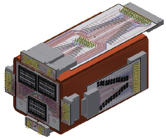 The two arrays used in the Lamb Shift experiments had an active detector area of 2 mm2 and 4 mm2, which resulted in an overall detection efficiency (including solid angle) of 7 × 10−7 and 1.4 × 10−6 under the given experimental conditions at the ESR. The main goal of the next generation silicon microcalorimeter array was to increase this detection efficiency by increasing the active detector area to about 30 mm2. As the heat capacity limits the active area of one single detector pixel, the number of the detector pixels has to be increased from 12 as of now to 96. On the other hand, the geometrical constraints at the ESR gas-jet target limit the outer diameter of the side arm to 90 mm [60,65]. Accordingly, the mount of the detectors was re-designed by introducing additional high-density plugs in order to fit three detector arrays with a total of 96 pixels inside the vacuum chamber of the side arm (see Figure 5). A prototype setup with one detector array with 32 pixels was constructed and successfully tested at the ESR [66]. The new design is displayed in Figure 6. Since the first test, improvements in the production procedure have led to an energy resolution of 120 eV at an X-ray energy of 60 keV. The energy resolution is currently limited by vibrational noise from the pulse tube. Further improvements in performance are expected by installing effective vibration damping in the cryogenic setup. In parallel, the production of the 96 pixel array is currently in progress.