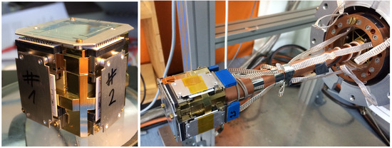 The main aim of the most recent beam time was to increase the active detection area by using the newly developed two-dimensional detector array maXs-30 and to further improve the energy resolution. On the left-hand side of Figure 14, the experimental setup consisting of one maXs-30 chip surrounded by eight SQUID chips, each equipped with four single SQUID magnetometers that were fabricated in our cleanroom [83], is depicted.