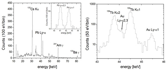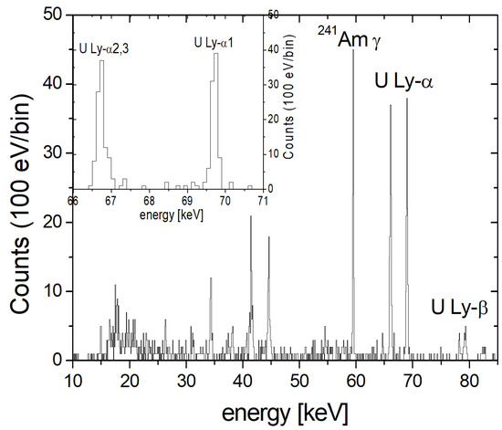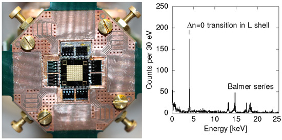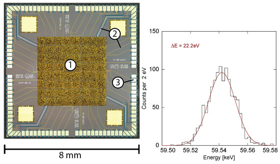 Recently, our first two-dimensional detector array maXs-30 with 64 microcalorimeters has been employed [78]. On the left-hand side of Figure 8, a photographic image of the detector chip consisting of 64 pixels with a total active detection area of 16 mm2 is shown. With a nominal absorber thickness of 30 µm, a quantum efficiency above 30% is achieved for X-ray energies up to 50 keV as well as between 80 keV and 90 keV. On the right-hand side of Figure 8, an energy resolution of = 22 eV for the 60 keV -line of 241Am is demonstrated. As this measurement was suffering from temperature instabilities and a persistent current that was smaller than optimal, the expected energy resolution of below 6 eV could not be achieved.
