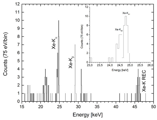 After the new pulse-tube-cooled cryostat was commissioned in the laboratory, it was for the first time applied at the ESR in a test experiment on hydrogen-like xenon using the detector array which was used in the Lamb Shift experiment [60,61]. While the cryostat with liquid nitrogen and liquid helium, which was used before in the Lamb Shift experiments, had always suffered from instabilities of the operating temperature which had to be corrected offline [81], the new cryostat maintained an excellent temperature stability over several days, which allowed for measuring X-rays with a very small count rate of 1 × 10−3 Hz. Figure 12 shows an example spectrum with the K and K lines as well as the line of K-shell Radiative Recombination (K-REC), respectively.