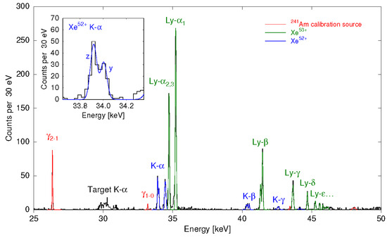 The detector arrays maXs-200 and maXs-30 have been operated in first experiments at the ESR during three beam times to investigate the operation of magnetic calorimeters in the environment of a storage ring [78]. In the experiments, no degradation of detector performance due to external magnetic fields was encountered. In Figure 13, a spectrum is shown that has been taken with two pixels of a maXs-200 detector array at the gas-jet target of the ESR as an incident beam of bare Xe54+ ions at a beam energy of 50 MeV/u was crossing a gas jet of neutral Xe atoms [77].