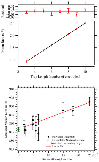 (Top): Data from the 2005 NIST beam neutron lifetime experiment [25], showing the proton count rate vs. trap length. (Bottom): Measured neutron lifetimes using different detectors and acceleration potentials vs. backscatter probability. The corrected neutron lifetime is found by linear extrapolation to zero backscatter.