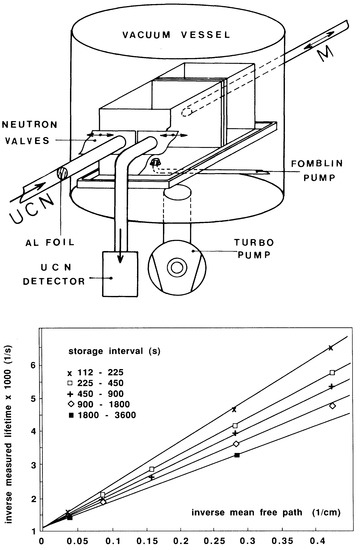 with the loss probability per bounce, v the neutron velocity, and the mean free path given by , where is the volume to surface ratio in the bottle. The rear wall of the bottle was moved by a piston in order to vary the surface to volume ratio and the movable wall contained sinusoidal corregations to randomize the trajectories of reflected neutrons. An issue arises from the fact that the neutrons are not monoenergetic and is velocity dependent so varies in a complicated way with time. At the beginning of each measurement cycle UCN were admitted into the bottle under precisely the same conditions so the initial neutron velocity spectrum immediately after filling is the same. If the storage time is chosen to be proportional to , then for two sets of measurements with different (different rear wall positions), the average number of wall reflections during and will be the same for both sets. Furthermore the neutron velocity spectrum will evolve in the same way for both sets at a rate proportional to . Therefore because each set experienced the same number of wall reflections, the data can be linearly extrapolated to zero wall reflection rate, as shown in Figure 4 (bottom).