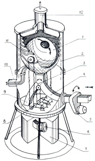 The original Gravitrap neutron lifetime bottle apparatus [38]: (1) UCN storage bottle; (2) liquid nitrogen screen; (3) neutron distribution valve; (4) neutron guide; (5) neutron filling valve; (6) He neutron counter; (7) radiation shielding; (8) rotational control linkage; (9) neutron guide; (10) cryogen lines; (11) cryostat; (12) frozen oxygen system.