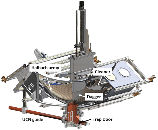 A rendering of the UCN apparatus [45,46] showing the Halbach array installed on the walls of the UCN storage vessel, the polyethylene sheet used to clean the initial neutron velocity spectrum, and the insertable in situ neutron scintillation detector (dagger). To fill the vessel, polarized neutrons are admitted via the trap door at the bottom.