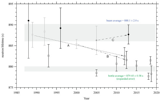 These events were followed by a general trend of lower neutron lifetime results from UCN storage experiments. In 2010 the MAMBO II experiment [36] found a result slightly higher but consistent with Gravitrap 2005. Shortly thereafter Steyerl et al. published a reanalysis of the MAMBO I data including a new, more sophisticated, estimate of quasielastic scattering effects [37]. This is indicated by the dashed line A in Figure 8. In 2012 the group Arzumanov et al. [48] reported a reanalysis of their previous 2000 result [49] reevaluating a number of systematic effects, in particular the differences between detection efficiencies for neutrons in the two geometries used. The updated value was lower than the original by 3.8 s, see dashed line B in Figure 8. A subsequent experiment by the same group measured s [50]. Three new UCN storage measurements were published in 2018 [43,44,46], all clustered around 880 s. A weighted average of the nine current UCN storage lifetime measurements shown in Figure 8 gives s with . Expanding the uncertainty by gives s.