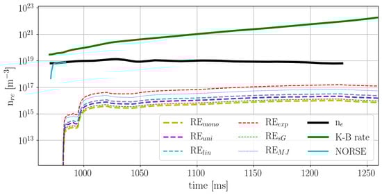 The above experimental results are compared here with the Kruskal–Bernstein theory [] and NORSE simulation [] in Figure 3. Kruskal–Bernstein theory is the analytical solution for growth rate of the Dreicer mechanism of RE generation, whose last shape was derived by Connor and Hastie []. The Kruskal–Bernstein equation is a strong function of the . NORSE calculateS only Dreicer mechanism of RE generation and , and are taken as time-varying parameters, while and are constant. Finally, the is computed by multiplying the total electron density from measurements with the RE fraction calculated by NORSE.